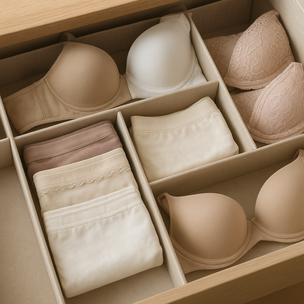 - Pudełka i organizerki z przegrodami ułatwiają segregację bielizny według typu i koloru.